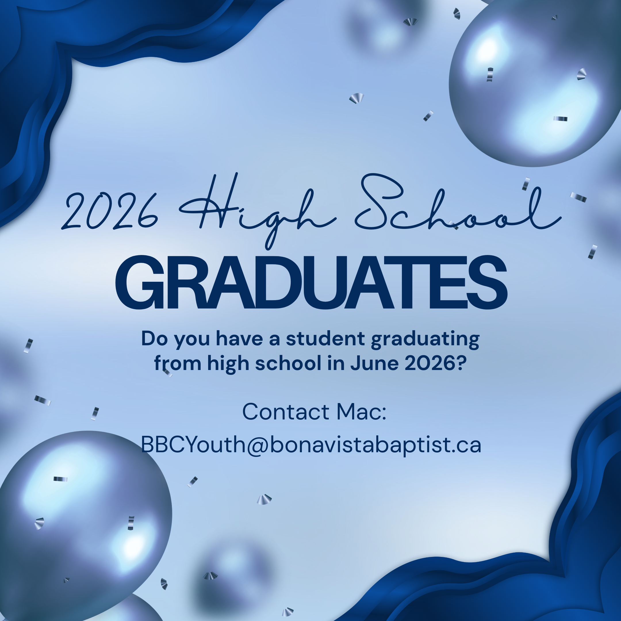 Email BBCYouth@bonavistabaptist.ca to be added to the email list.
